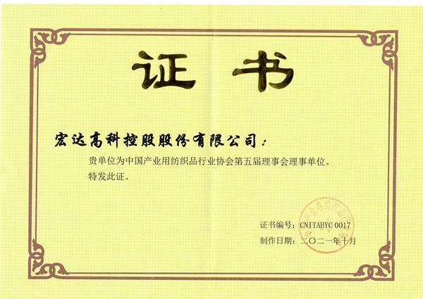 2021年10月20日,中國產(chǎn)業(yè)用紡織品行業(yè)協(xié)會(huì)(以下簡稱“中產(chǎn)協(xié)”)第五次會(huì)員代表大會(huì)暨協(xié)會(huì)成立20周年紀(jì)念活動(dòng)在北京召開。會(huì)議圍繞換屆選舉、20周年紀(jì)念等主題,共話產(chǎn)業(yè)用紡織品行業(yè)發(fā)展方向。會(huì)上,宏達(dá)高科入選中國產(chǎn)業(yè)用紡織品協(xié)會(huì)第五屆理事會(huì)理事單位。
