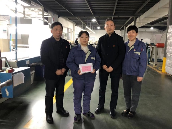 2021年12月10日下午,公司總經(jīng)理許建舟、工會主席潘建華來到質(zhì)保部,為質(zhì)保部員工孫秀芬送上慰問金。