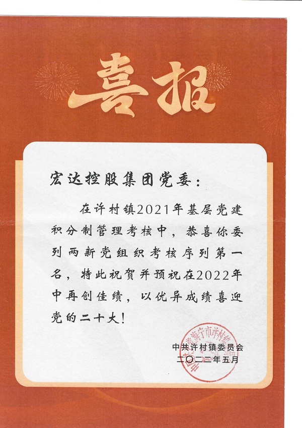 宏達控股集團黨委在許村鎮(zhèn)2021年基層黨建積分制管理考核中,委列兩新黨組織考核序列第一名。