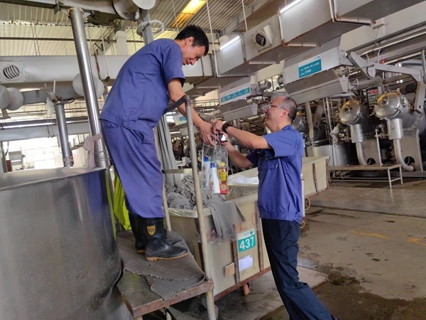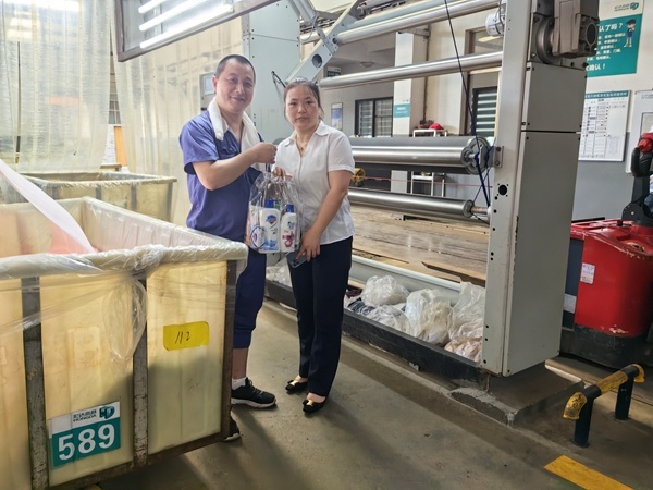 在“宏達(dá)高科”溫度最高的染整定型、染整染色車(chē)間,公司管理人員向堅(jiān)守崗位的一線員工表示親切的慰問(wèn)和感謝,為他們送上毛巾、沐浴露等清涼用品,囑咐大家高溫生產(chǎn)不忘安全,做到勞逸結(jié)合,并要求各部門(mén)切實(shí)做好防暑降溫工作,保障員工健康安全。