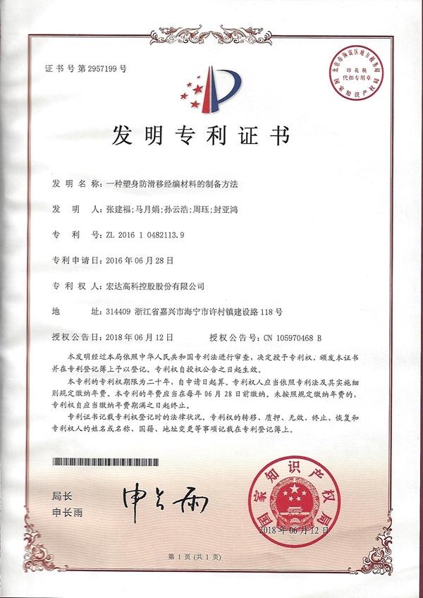 據(jù)了解,本次“宏達(dá)高科”獲得專利的發(fā)明內(nèi)容是:一種塑身防滑移經(jīng)編材料的制備方法;運(yùn)用本專利所制備的運(yùn)動(dòng)服飾面料,其氨綸彈性纖維面與人體接觸時(shí)對(duì)皮膚具有一定的黏附性,能減小運(yùn)動(dòng)時(shí)服飾面料的滑移,從而減小摩擦;又因該面料拉伸彈性大,能對(duì)人體肌肉有一定的壓力、起固定作用,因此還能有效防止運(yùn)動(dòng)時(shí)造成的肌肉、關(guān)節(jié)受傷,減輕運(yùn)動(dòng)人員的肌肉疲勞度,提高運(yùn)動(dòng)塑身的效率和效果。另外2項(xiàng)獲得的外觀設(shè)計(jì)專利,是對(duì)公司自主開發(fā)的兩種汽車內(nèi)飾面料進(jìn)行的外觀設(shè)計(jì)專利保護(hù)。